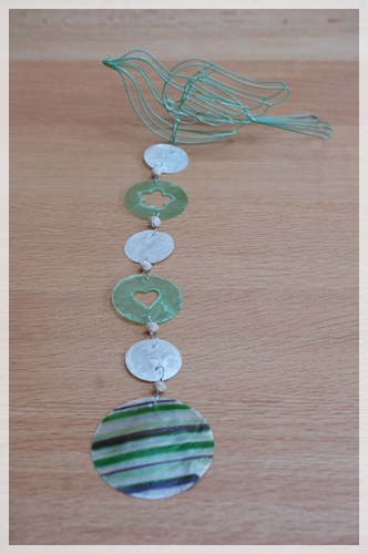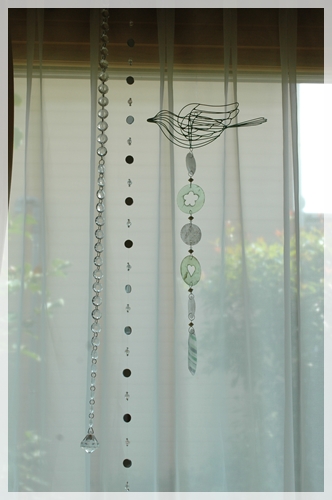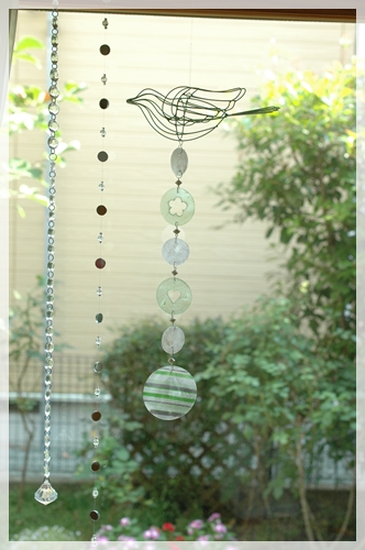 他のサンキャッチャーとちょっとくっつけてぶら下げると、エアコンの風で貝の部分がカシャカシャといい音を鳴らすのよ~