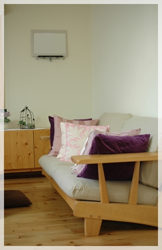 パープルとピンク系のクッションカバーに変えて、たくさんソファに載せました。