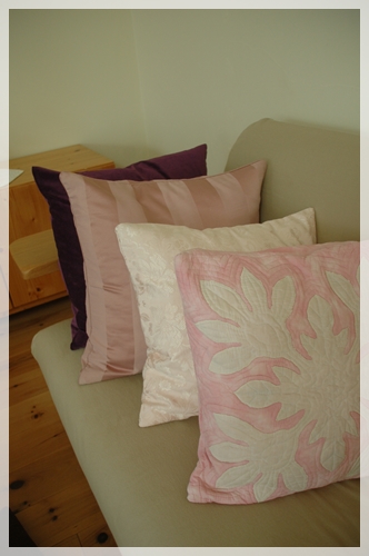 パーブルとピンクのクッションたち。今までのhana 家のイメージカラー(私が勝手に作り上げている)と違ってとっても新鮮で良い感じですね。