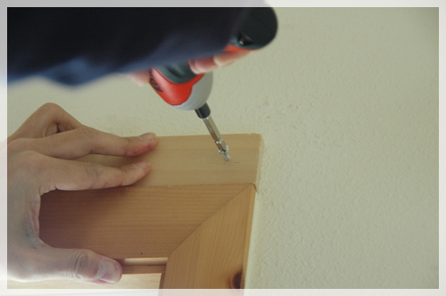 うちの窓はマーヴィン製の木製サッシで、木枠が壁よりも1cmほど飛び出している感じなので、木枠の上に木の板(小屋裏収納に眠っていた木の板を発掘して、ノコギリでちょうどよい長さに切りました)をネジ止め。日本製の窓だったらたぶんこの必要はないと思うのだけど…。