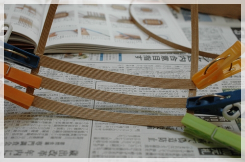 まずは底から。始末紐に横紐をボンドで止めていって。