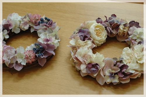 写真左側のリースはもう2年以上前に作っていただいて、ずっとリビングに飾っていますが、まだ全く色が褪せることがなく、美しいです♪