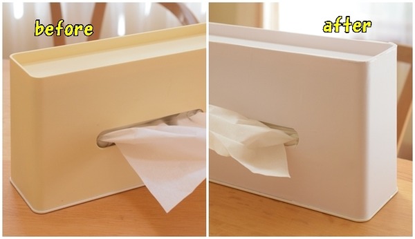 【ダイソーの110円リメイクシートで】黄ばんだプラスチックを簡単に真っ白に✨ 2024年09月11日 おはようございます♬5年前に、ニトリの縦型ティッシュケースを買いました。コンパクトで場所を取らないので気に入って、ずっとダイニングテーブルに置いて使っています。 ▼2019年の購入当初は真っ白でした(^-^;▼でもよく陽にあたる場所だからか、だんだんと黄ばんでしまっ